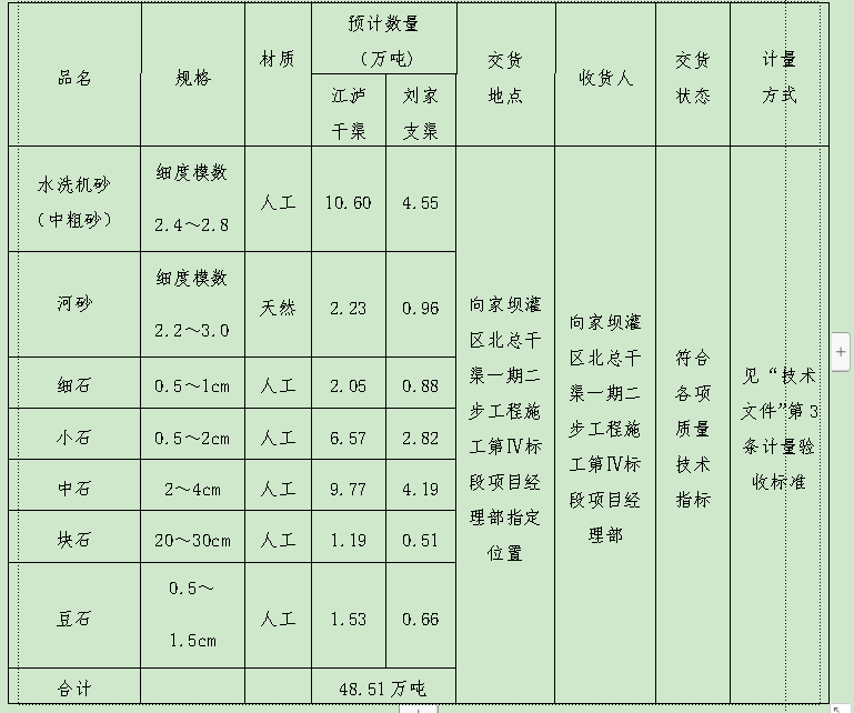 向家壩灌區(qū)北總干渠一期二步工程施工第Ⅳ標(biāo)段砂石采購清單