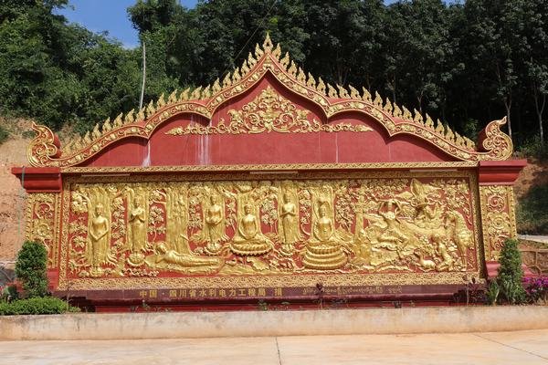 四川省水利電力工程局作為勐瓦電站的施工單位為這座釋迦牟尼大佛捐建了一座精美佛像照壁,表達對當?shù)孛袼鬃诮痰淖鹬睾蛯峦唠娬窘ㄔO(shè)友好合作的良好祝愿。