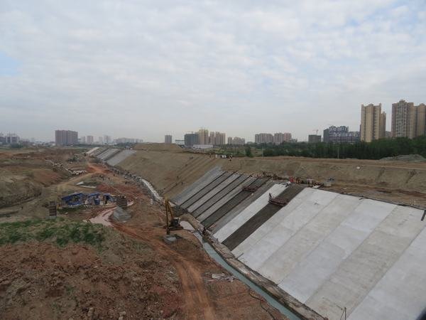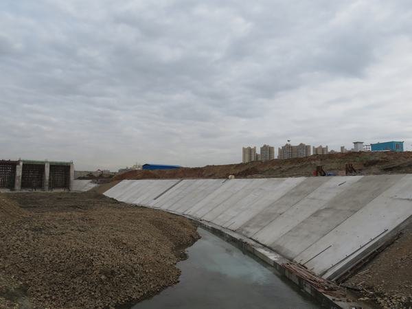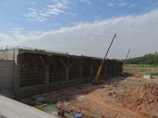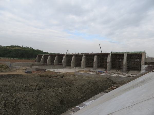 攔河閘上游攔河閘下游閘頂工作橋施工閘下游護(hù)岸施工左岸防洪堤施工