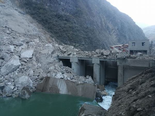 博瓦水電站首部樞紐工程于2019年11月初已通過(guò)下閘蓄水前的安全鑒定。2019年11月19日凌晨,在工程所在地發(fā)生3.9級(jí)地震,受地震影響,閘壩左右岸自然高邊坡發(fā)生高位巖體崩塌,大方量的左岸崩塌巖體自400米高處墜落,造成導(dǎo)流洞進(jìn)口及取水口全部掩埋,上游河道嚴(yán)重淤堵,壩頂建筑物和金屬結(jié)構(gòu)的全部損毀,施工現(xiàn)場(chǎng)的機(jī)械設(shè)備、材料等全部損毀掩埋,所幸無(wú)任何人員傷亡。閘壩1#、2#泄洪沖砂閘孔已被堵塞無(wú)法過(guò)流,只剩3#泄洪沖砂閘孔過(guò)流,庫(kù)區(qū)水位已雍高近6m,嚴(yán)重影響汛期河道安全行洪。