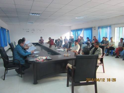 2015年4月12日,第一工程處在云南省鹽津縣萬年橋電站項目部組織職工傳達(dá)學(xué)習(xí)工程局2015年工作會議精神,第一工程處范雪山處長主持會議。