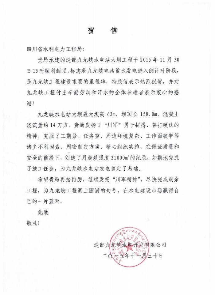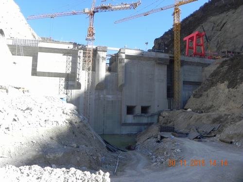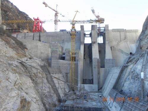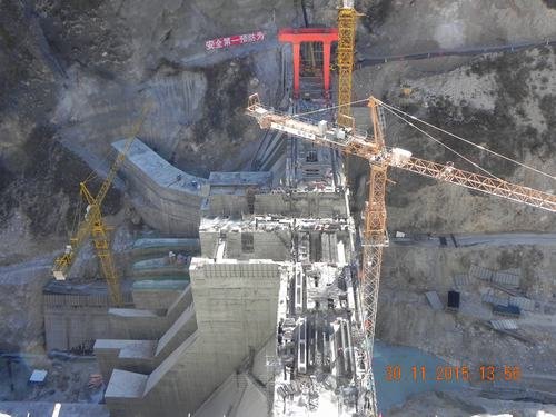 11月30日15時(shí),九龍峽水電站大壩工程4#壩段2#梁吊裝完閉,標(biāo)志著歷時(shí)3年艱辛建設(shè)的九龍峽水電站大壩工程已達(dá)到全線封頂目標(biāo)。九龍峽水電站共有9個(gè)壩段,壩高62米,壩長(zhǎng)158米,混凝土澆筑量約14萬方。