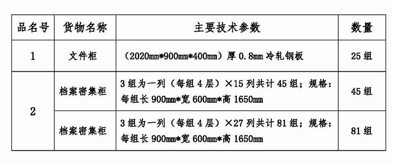 1.2供貨周期:此次采購分三批供貨,首批擬在2021年9月開始供應密集架45組(600mm×900mm×1650mm);第二批擬在2022年3月供應密集架81組(600mm×900mm×1650mm);第三批擬在2022年6月供應文件柜25組(900mm×400mm×2020mm)。簽訂合同后,所列項目清單貨物交付完成約需10個月。