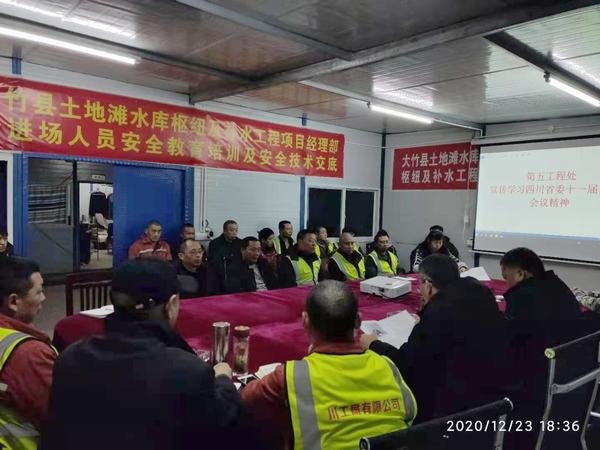 2020年12月23日,第五工程處在承建的大竹縣土地灘水庫樞紐及補水工程項目部召開職工大會,宣傳學(xué)習(xí)四川省委十一屆八次全會精神和周永開等全國優(yōu)秀共 產(chǎn) 黨員先進事跡及中共中央、國務(wù)院關(guān)于表彰全國勞動模范和先進工作者的決定。會議由第五工程處處長陳道剛主持。