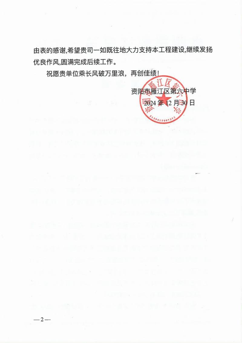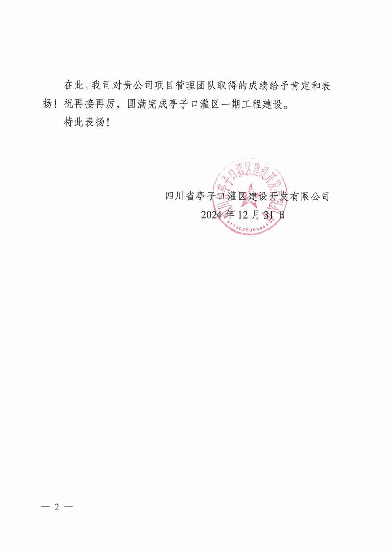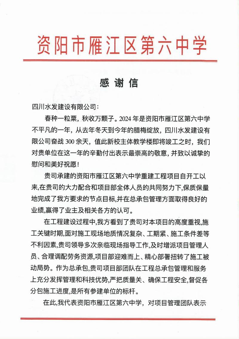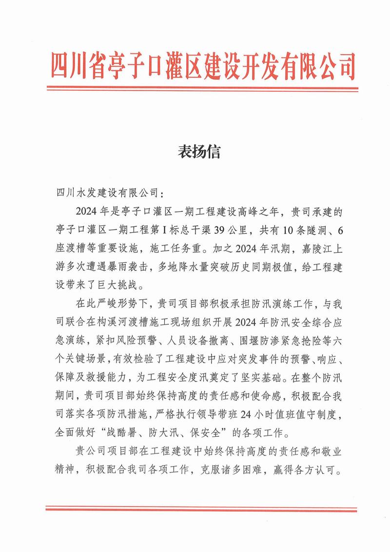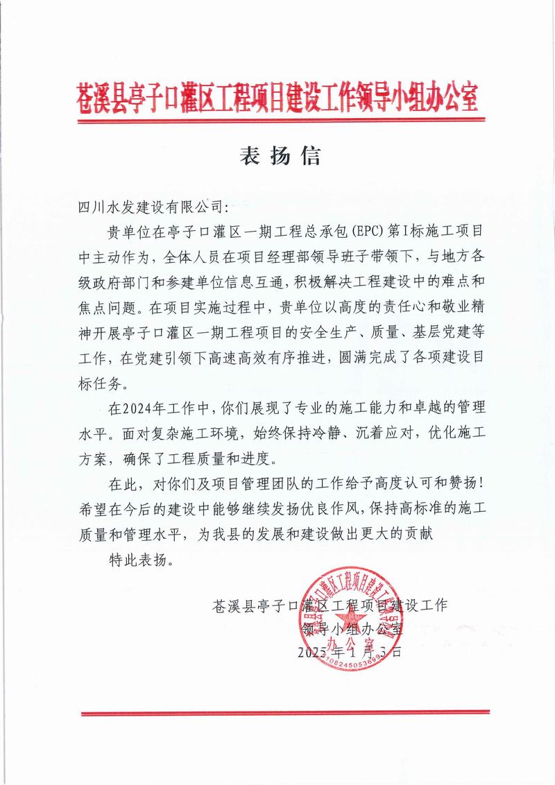 亭子口項目收到蒼溪縣亭子口灌區(qū)工程項目建設(shè)工作領(lǐng)導(dǎo)小組辦公室、四川省亭子口灌區(qū)建設(shè)開發(fā)有限公司發(fā)來的表揚信;資陽市雁江區(qū)第六中學(xué)重建工程項目收到資陽市雁江區(qū)第六中學(xué)發(fā)來的感謝信;平昌縣友誼水庫除險加固工程及友誼灌區(qū)2023—2025年續(xù)建配套與節(jié)水改造項目收到平昌縣友誼水庫運行保護中心的表揚信;萬源市城鄉(xiāng)一體化工程建設(shè)項目收到萬源市萬寶源水務(wù)投資開發(fā)有限公司發(fā)來的感謝信。