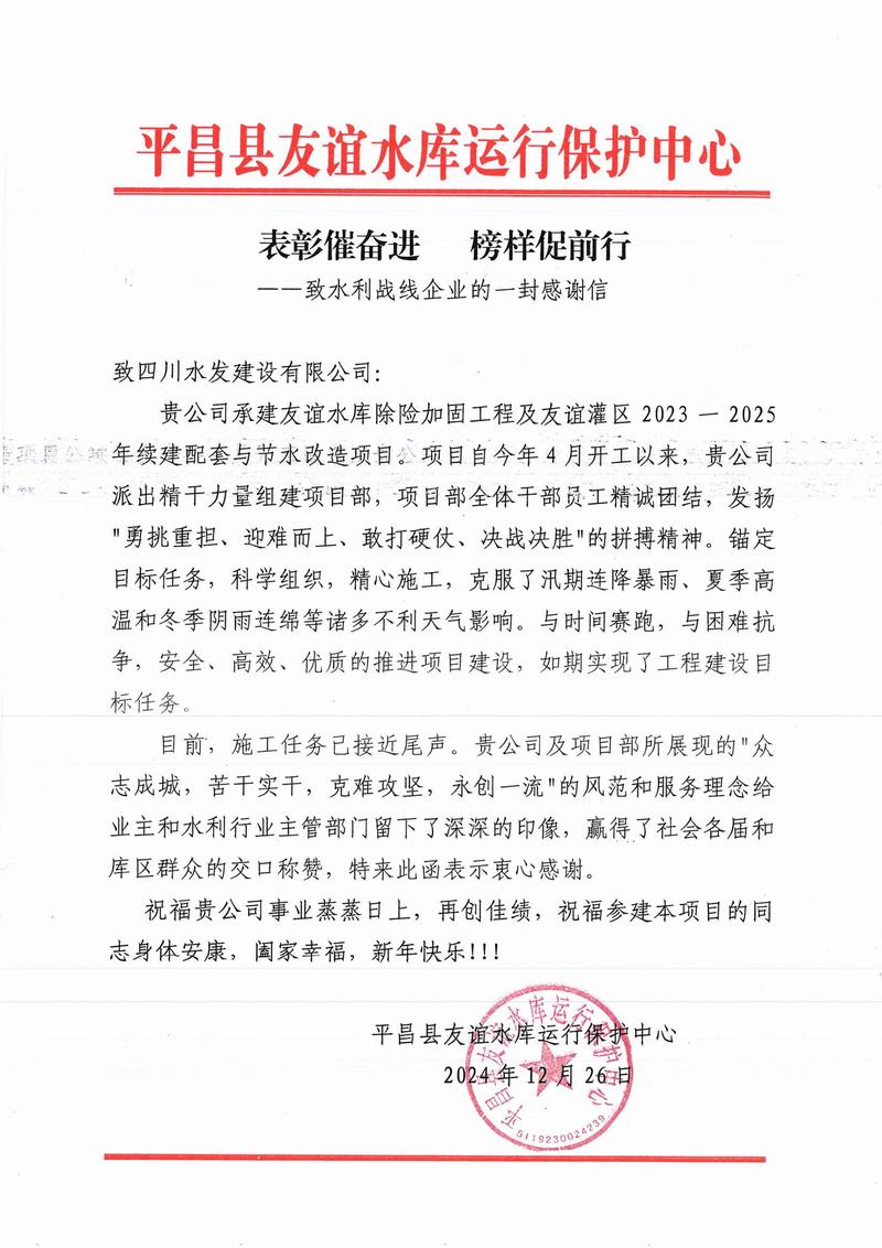 封封表彰催奮進,信心滿滿展未來。四分公司將繼續(xù)以“勇毅篤行、內(nèi)斂堅韌”的企業(yè)精神勇往直前,以高度的責(zé)任感和使命感,不斷提升項目管理水平和服務(wù)質(zhì)量,積極履行社會責(zé)任,為推動地方經(jīng)濟發(fā)展貢獻(xiàn)四川水發(fā)力量。