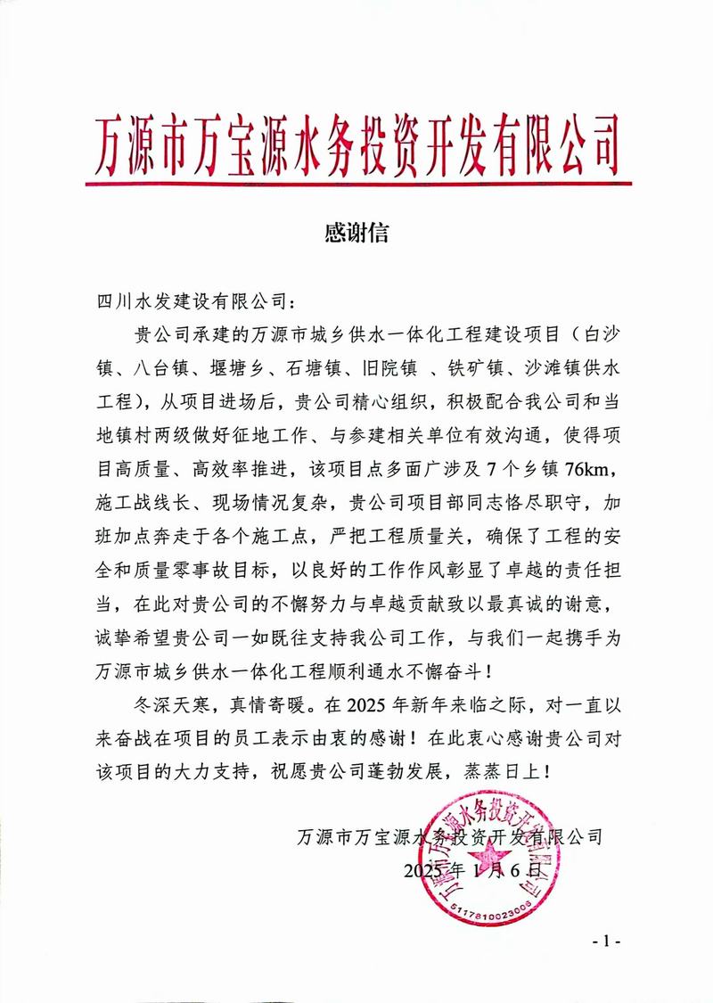 2024年,四分公司秉承“川水善建映初心”的初心使命,堅持“遵約守信、融合發(fā)展”的經(jīng)營理念,積極履行企業(yè)責(zé)任擔(dān)當(dāng),用實際行動贏得了業(yè)主及相關(guān)單位的高度認(rèn)可,收獲多封表揚信和感謝信。