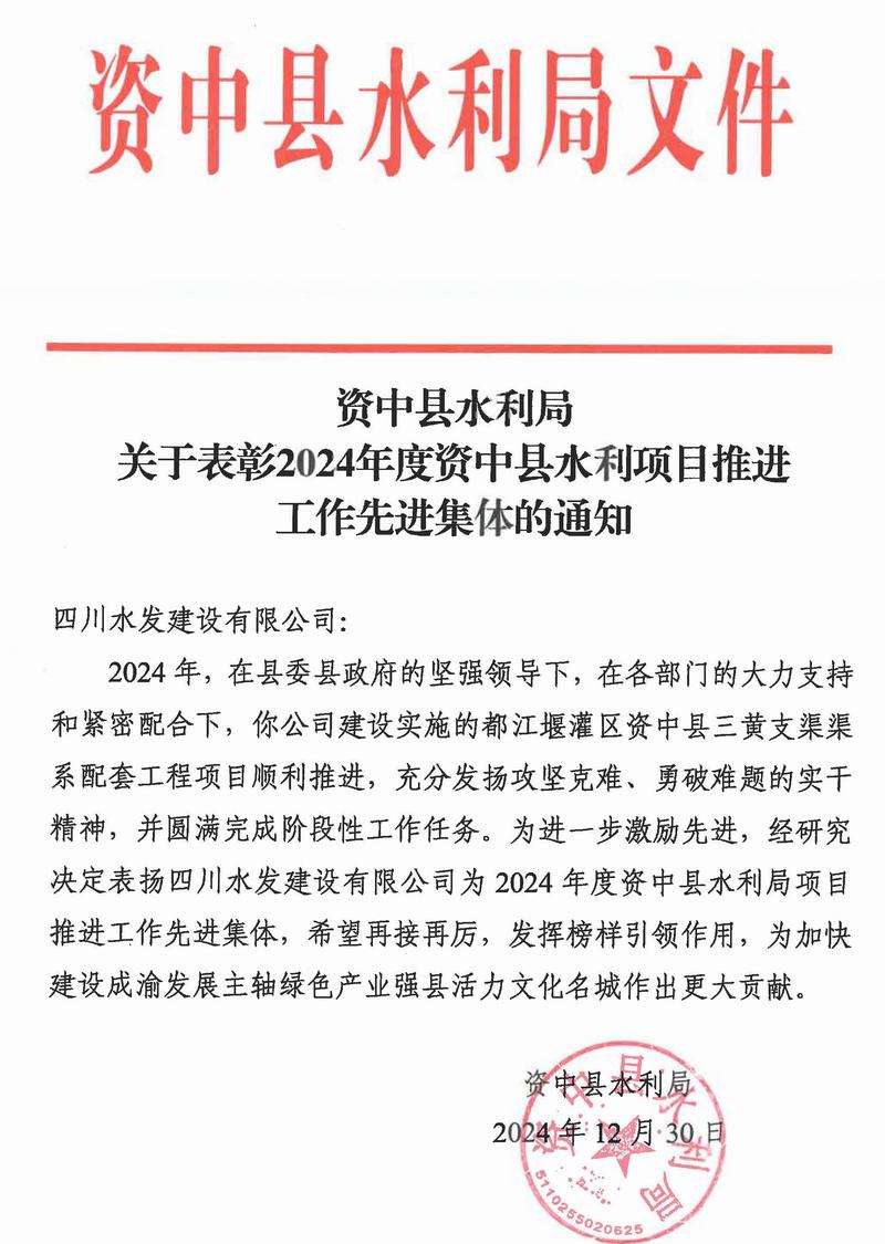 近日,二分公司承建的都江堰灌區(qū)資中縣三黃支渠渠系配套工程項(xiàng)目榮獲資中縣水利局“2024年度資中縣水利局項(xiàng)目推進(jìn)工作先進(jìn)集體”稱號,充分肯定了三黃支渠項(xiàng)目在2024年的辛勤付出。